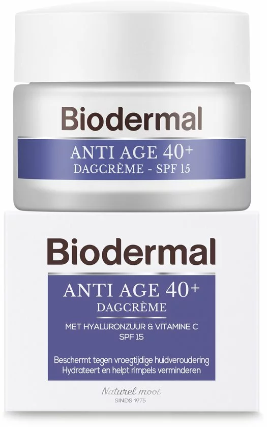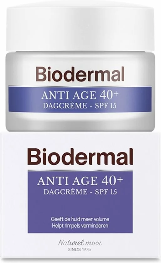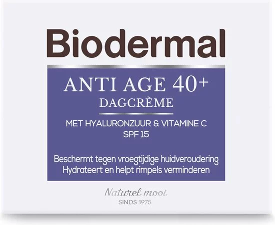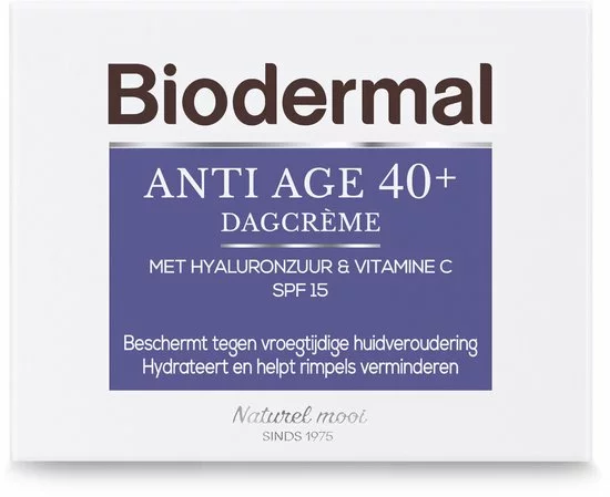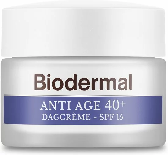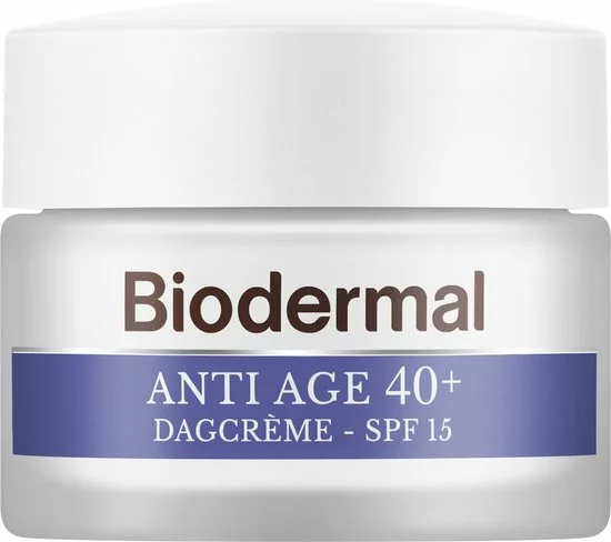 Rond het 40e levensjaar ontstaan de eerste tekenen van huidveroudering zoals fijne lijntjes, rimpels en een oneffen huidteint. Biodermal Anti Age 40+ dagcr?me beschermt de huid effectief tegen huidveroudering en geeft intensieve hydratatie. De cr?me helpt fijne lijntjes en rimpels zichtbaar te verminderen en zorgt voor een gladde huid. Het geeft de huid een meer gelijkmatige teint en verbetert de huidelasticiteit van gezicht en hals. Met als resultaat een huid die niet alleen stralender oogt maar ook strakker en gladder aanvoelt. Bevat SPF 15: beschermt tegen UVA- en UVB-straling.