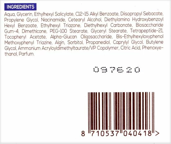 Aqua, Niacinamide, Ethylhexyl Salicylate, Neopentyl Glycol Diheptanoate, Glycerin, Propylene Glycol Dibenzoate, Bis-PEG/PPG-16/16 PEG/PPG-16/16 Dimethicone, Propanediol, Dimethicone, Cetyl Dimethicone, Diethylhexyl Carbonate, Diethylamino Hydroxybenzoyl Hexyl Benzoate, Ethylhexyl Triazone, Silica, Bis-Ethylhexyloxyphenol Methoxyphenyl Triazine, Canola Oil, Hydrolyzed Hyaluronic Acid, Ascorbyl Tetraisopalmitate, Tocopheryl Acetate, Xylitylglucoside, Anhydroxylitol, Xylitol, Glucose, Cetearyl Alcohol, Glyceryl Stearate, Polysorbate 80, Caprylic/Capric Triglyceride, Ammonium Acryloyldimethyltaurate/VP Copolymer, Acrylates/C10-30 Alkyl Acrylate Crosspolymer, Xanthan Gum, Citric Acid, Pentaerythrityl Tetra-di-t-butyl Hydroxyhydrocinnamate, Phenoxyethanol, Sodium Benzoate, Parfum.