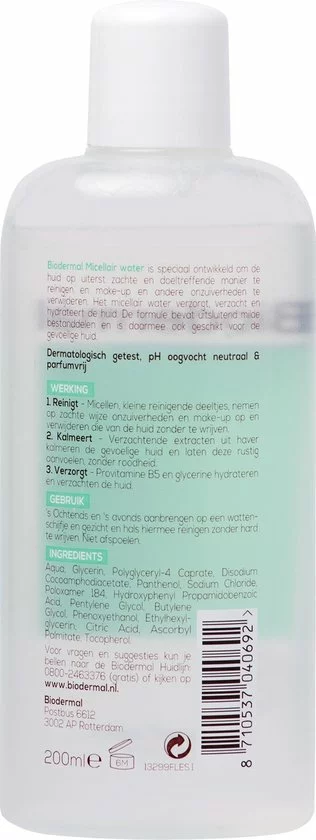 Biodermal Micellair water reinigt de huid op uiterst milde wijze en is een doeltreffende manier om make-up en andere onzuiverheden te verwijderen. Het micellair water verzacht, verzorgt en hydrateert de huid. Je kunt Biodermal Micellair water gebruiken voor het: