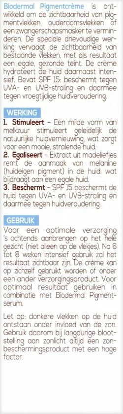 Biodermal pigmentvlekken creme met SPF 15 is speciaal ontwikkeld om de zichtbaarheid van pigmentvlekken, een zwangerschapsmasker en vlekken door ouderdom te verminderen. De intensieve werking van deze cr?me vermindert de zichtbaarheid van bestaande vlekken. Hierdoor krijgt je huid een gezonde en egale teint. Daarnaast bevat deze cr?me SPF 15 waardoor de huid wordt beschermt tegen UVA- en UVB-straling, daarmee helpt deze cr?me huidveroudering te vertragen.
