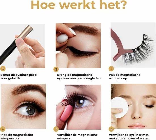 Het enige wat je hoeft te doen is de magnetische eyeliner goed schudden, zodat de magneetdeeltjes verdeeld worden. Vervolgens breng je het aan en laat je dit 1-2 minuten drogen. Plaats je de magnetische wimpers (met bijgeleverde pincet) eenvoudig op je wimpers. De Magnetische wimperextensions hebben een sterke hechting waardoor het stevig en snel aan de magnetische eyeliner blijft plakken. Done! Geen geknoei! Geen stress! Snel en gemakkelijk een prachtige look!