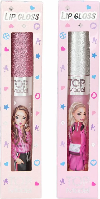 Voor schitterende TOPModel lippen: de roze lipgloss ruikt naar aardbeien en de donkerroze naar cola. Beiden met glitter dop en prachtige TOPModel print. Inhoud flesjes: 2,8 ml.
