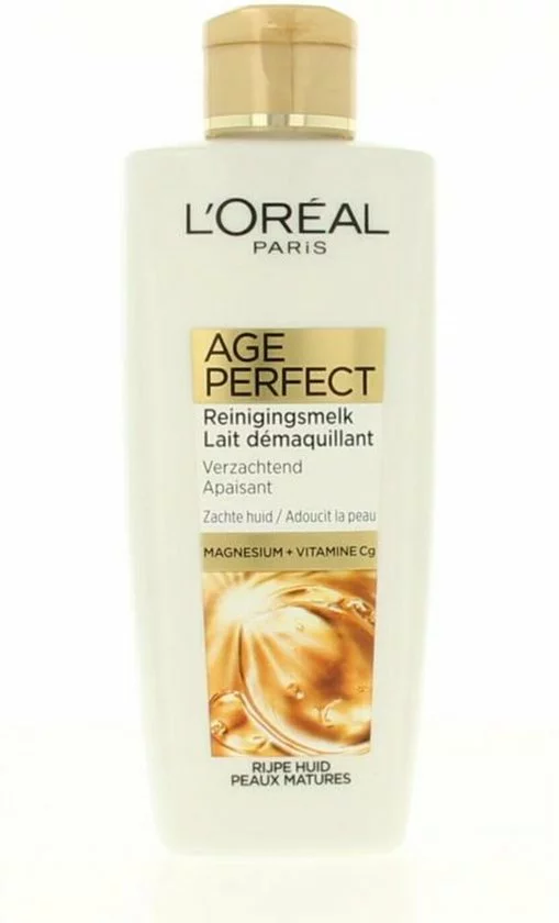 L’Oral Age Perfect ReinigingsmelkDeze reinigingsmelk helpt de rijpe huid onmiddellijk te ontkreuken en te verfrissen. Daarnaast helpt het uitdroging van de huid te voorkomen. Geschikt voor de rijpe huid, voor vrouwen boven de 50 jaar.