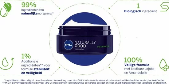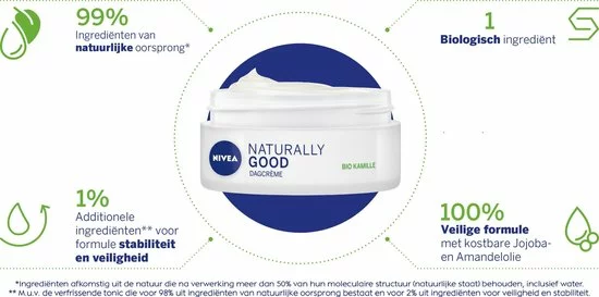 NIVEA Naturally Good Dagcr?me Sensitive is gemaakt met uw gevoelige huid in gedachten. De formule met 99% ingredi?nten van natuurlijke oorsprong* en 1% additionele ingredi?nten voor formule stabiliteit en veiligheid is bijzonder mild voor uw huid. De dagcr?me hydrateert je huid gedurende 24 uur en kalmeert huidirritaties en vermindert zichtbaar roodheid. De dagcr?me met bio Kamille geeft onmiddellijke verlichting van een trekkerig gevoel en is parfumvrij. Huidvriendelijkheid dermatologisch goedgekeurd.
