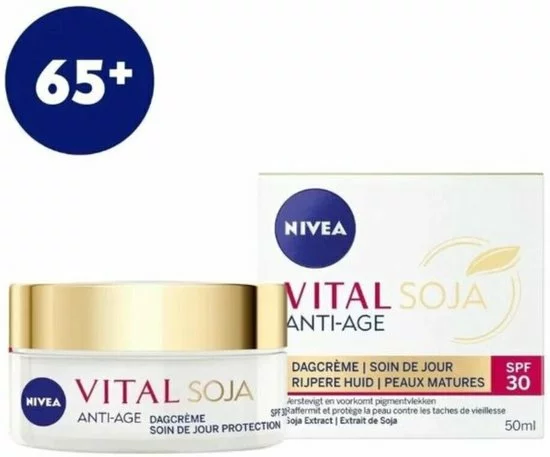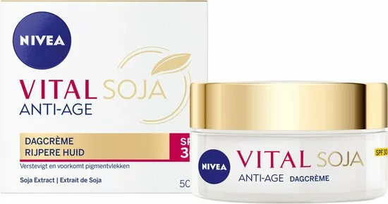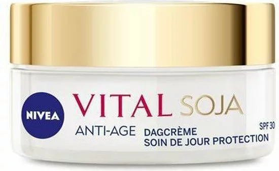 NIVEA Vital Soja Anti-Age Beschermende Dagcr?me SPF30 is verrijkt met sojaprote?nen en ondersteunen het herstelproces van de huid dat in de loop der jaren vertraagt. Deze dagcr?me stimuleert de celvernieuwing van de huid en haar vermogen om vocht vast te houden. Resultaat: langdurige rimpelvermindering. Bij regelmatig aanbrengen verkleint het zichtbaar de diepe rimpels en smalle lijntjes. Het vult de huid van binnenuit op en zorgt voor langdurige versteviging. Door toevoeging van SPF30 geeft de dagcr?me extra bescherming tegen schadelijke UVA/B stralen.