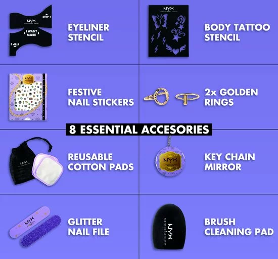 Wees zo goed om je stoute kant te tonen! Tel mee af tot de feestdagen, met deze 24-daagse adventskalender. De kalender bevat 8 populaire producten van NYX Professional makeup die bijdragen aan een prachtige make-uplook. Daarnaast bevat de kalender 8 handige make-up accessoires en 8 digitale ervaringen! 24 dagen vol kunstzinnigheid en entertainment! Limited edition. Vrij van dierproeven.