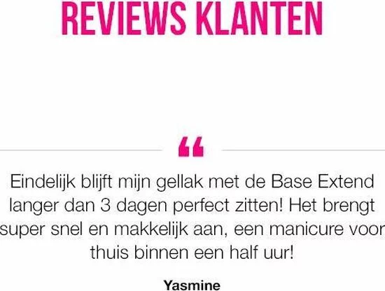 Blijft jouw gellak niet mooi zitten? Met de Base Extend van Pink Gellac los je dit op. Deze fijne base coat zorgt namelijk voor een goede hechting en sterkere nagels, zonder dat je daarvoor een Primer nodig hebt. De Base Extend is de snellere afweekbare base, zodat je de gellak makkelijk en snel kunt verwijderen zonder je nagels te beschadigen. Hard een dun laagje Base Extend eerst 60 seconden uit onder de LED lamp of 120 seconden onder de UV lamp, voordat je gellak aanbrengt.