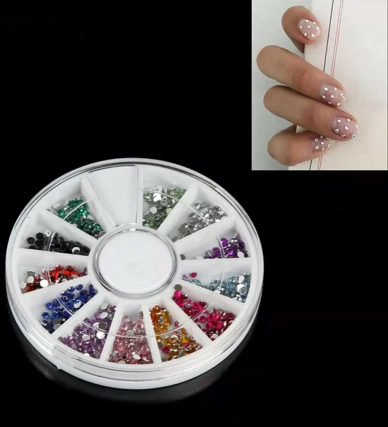 - 1 x 12 gevarieerde kleuren nagelsteentjes in rondo carousel