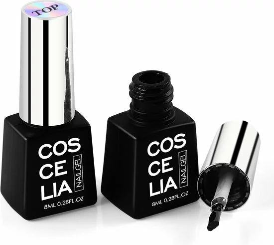 De ‘gewone’ gellak topcoat is een glanzende topcoat met een plaklaagje. Deze zit in deze set. Deze topcoat beschermt je lak, is mooi glanzend en glad en maakt er een egaal geheel van. Zoals elk gellak product moet deze topcoat natuurlijk worden uitgehard onder een UV of LED lamp!