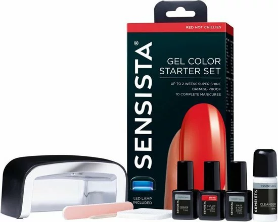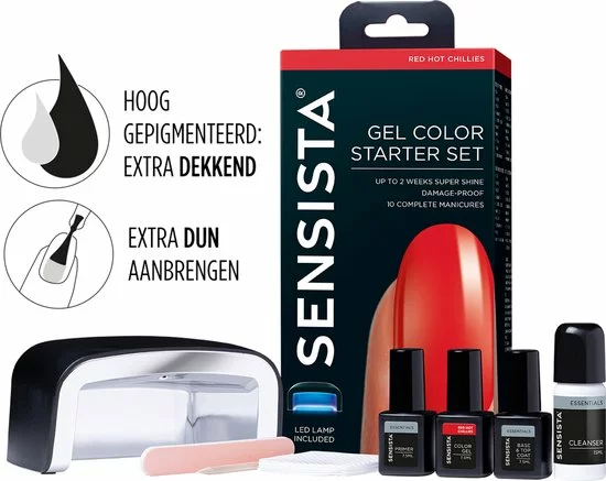 De Sensista Color Gel droogt alleen met de speciale Sensista LED-lamp (die ook in de Starter Set zit). Verder bevat de Starter Set ook nog de volgende producten: