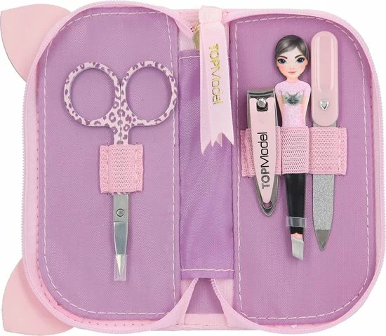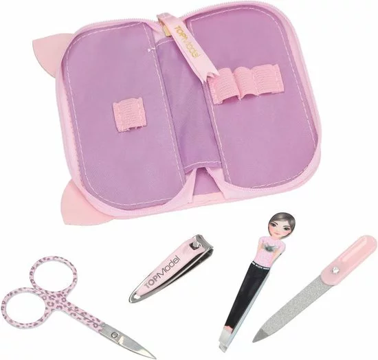 Jij hebt altijd mooi verzorgde nagels met deze manicureset van TOPModel met schattige kattenoortjes en gouden print. De set bestaat uit een nagelschaar, nagelknipper, pincet en nagelvijl. Alles van staal en met een vrolijke bedrukking.