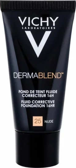De Dermablend Corrigerende Vloeibare Foundation van Vichy biedt tot 16 uur lang een hoge dekking. Deze foundation is geschikt voor mensen die hun lichte tot matige onvolmaaktheden van de huid willen corrigeren, zoals een onregelmatige teint, rode vlekken, puistjes, en littekens. De Dermablend corrigerende vloeibare foundation combineert een hoge pigmentconcentratie, voor een perfecte dekking en een vlekkeloze afwerking, met een lichte, rekbare textuur. Dit zorgt ervoor dat de foundation samensmelt met de huid voor een natuurlijk resultaat en een comfortabel gevoel de hele dag door maar geen maskereffect cre?ert. De foundation dekt volledig en heeft een matte finish.