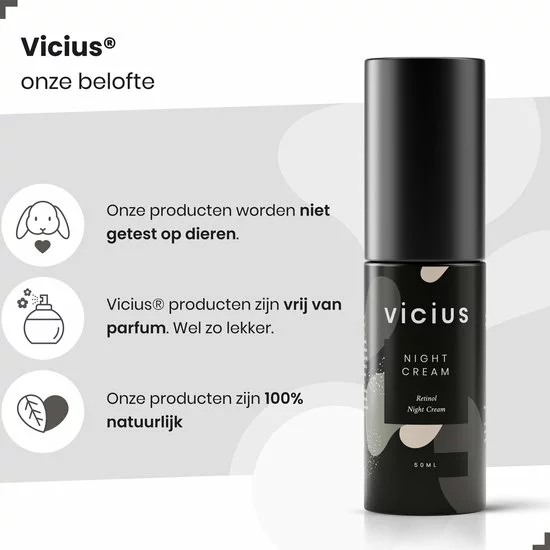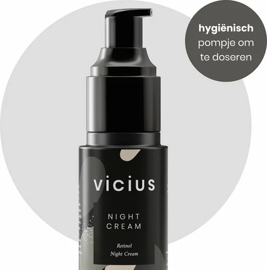 Vicius Retinol Night Cream is vegan, vrij van parfum en niet getest op dieren. De nachtcrème is zeer geschikt als;