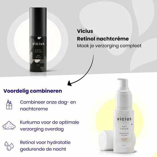 - Gebruik je Vicius Retinol Night Cream in combinatie met ons Vitamine C Serum? Dan adviseren we om het serum in de ochtend te gebruiken, voorafgaand aan jouw Turmeric Day Cream.